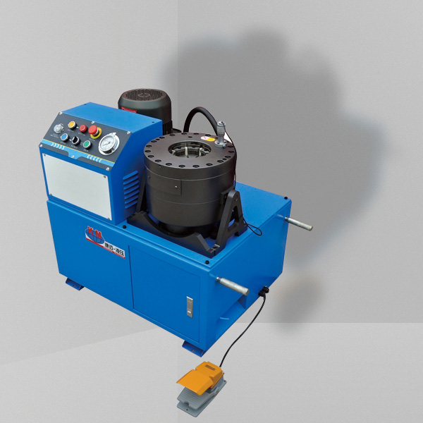 KM-91型系列縮管機,公司技術人員針對環形機加潤滑油不方便這一情況,在機頭上設計增加了自注潤滑油杯,模座上增加了油槽,模座間增加了彈性樹脂層,防止接頭上的鋅層脫落劃傷工作錐面和缸筒,考慮到現在扣壓時異型接頭較多這一現象,增加了機器的收擴量和通過能力。新型機頭支架的選用改變了機頭和支架長期焊接導致缸筒變形等一系列弊端。